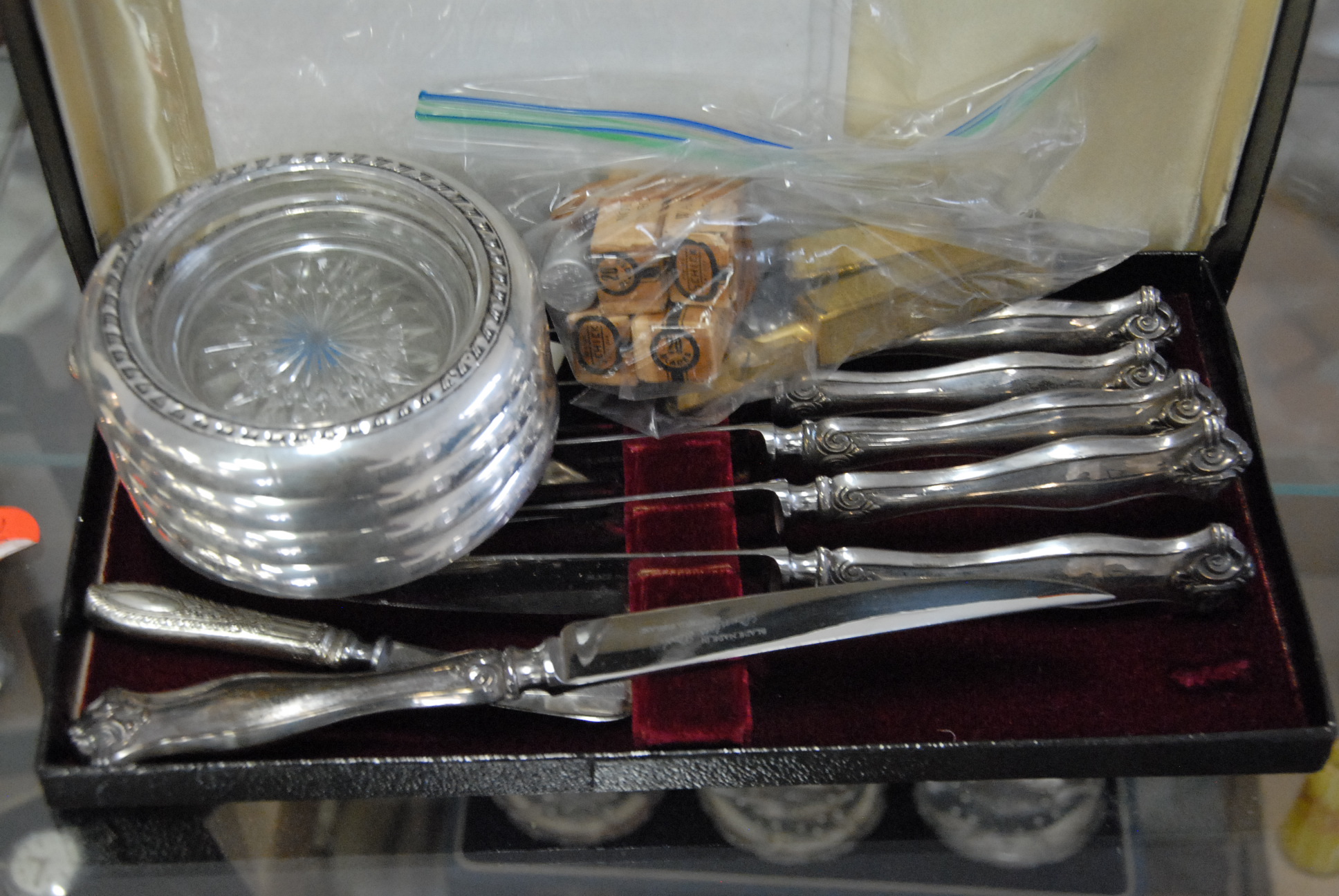 Group lot to include coasters with sterling silver rims and sterling silver handled knives along with unusual razors.