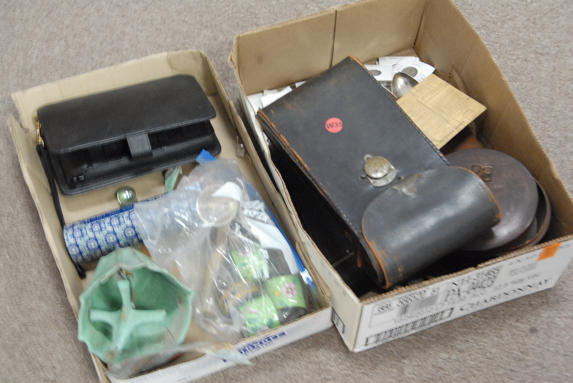 Two box lots to include coins, spoons, napkin holders, horn cocktail shaker with silver.