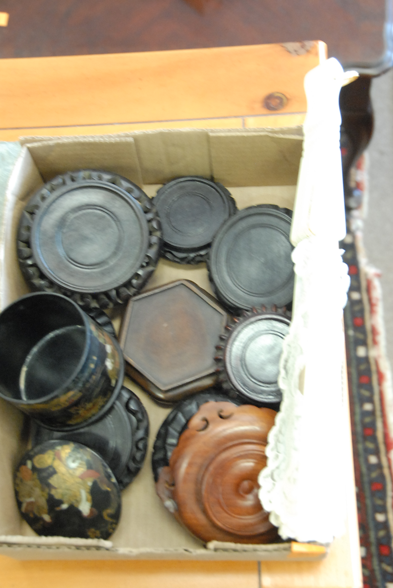 Three box lots to include Oriental wooden stands, cloissone, cinnabar jars, four small ivory figures, small table screen.