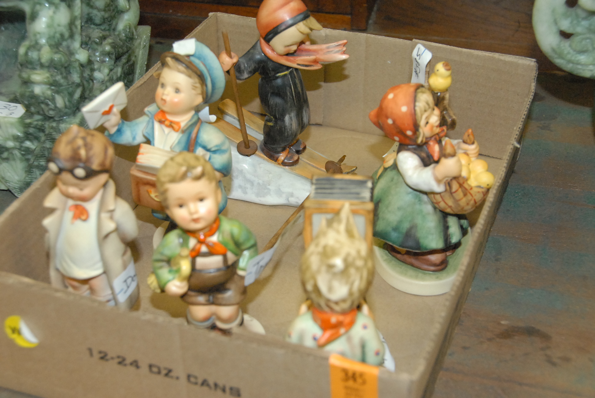Group of six Hummels to include Doctor, Postman, Chicken Lickin, Skier, Trumpet Boy, and The Photographer, some with crowns.