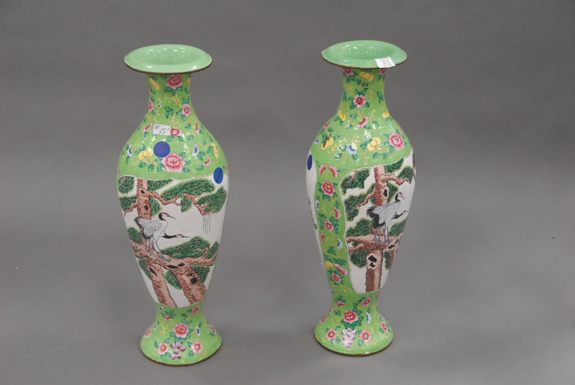 Pair of tall enameled vases, probably Japanese, excellent condition.
