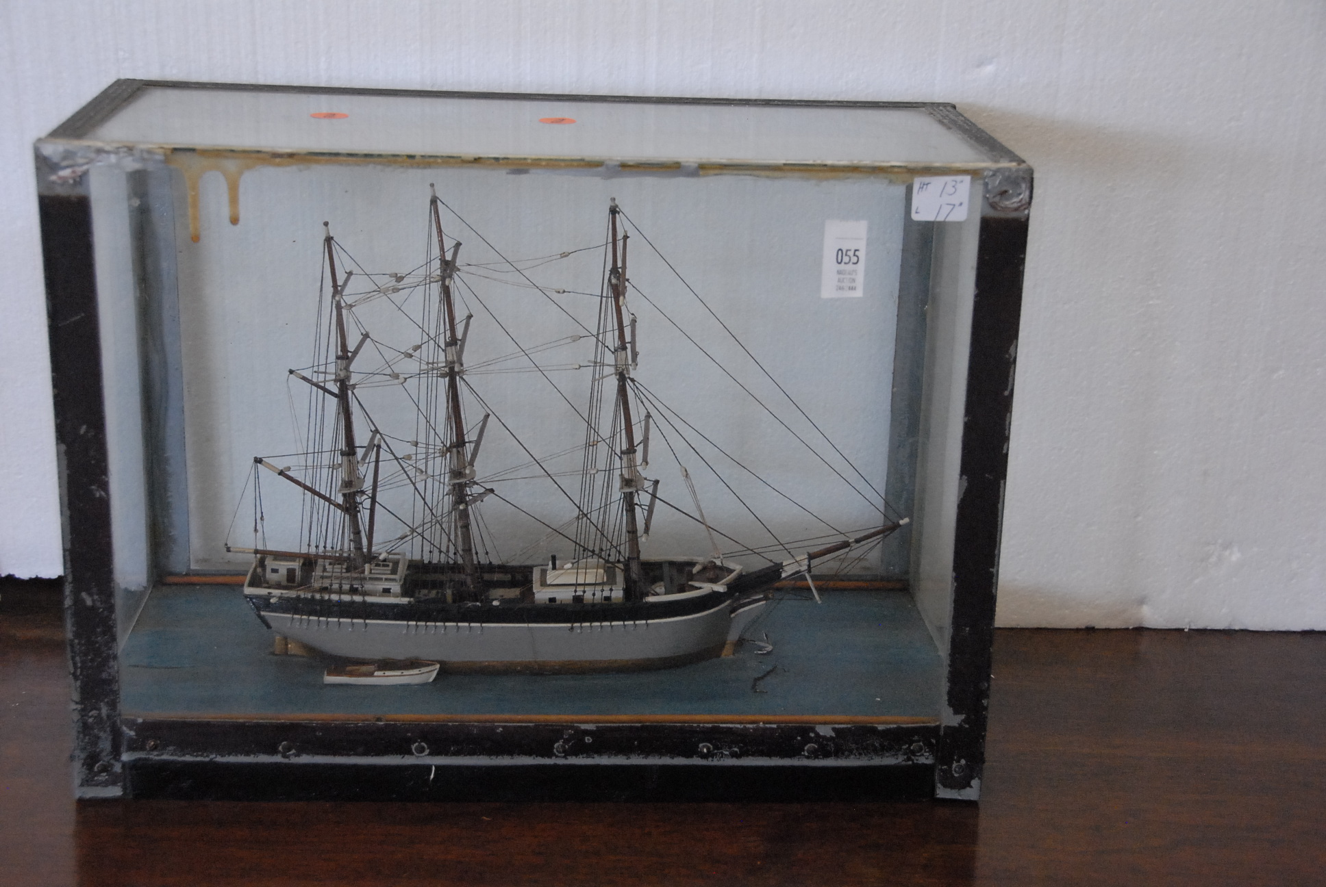 Three masted ship in a glass case.