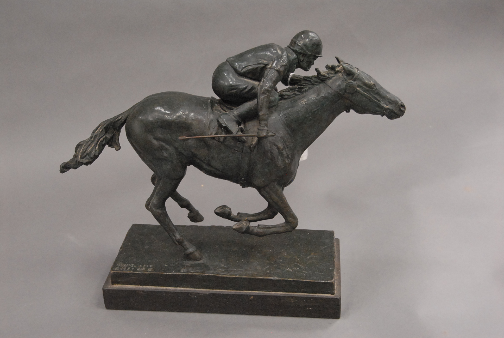 Bronze on a marble base of a horse and jockey in a race, signed Daniel Stixs 1983 artists proof.