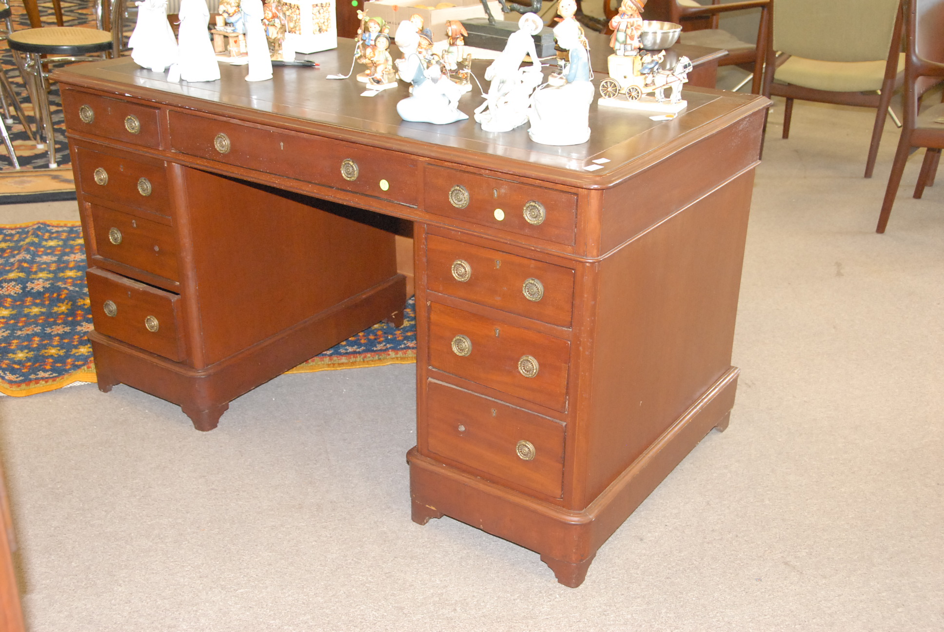 Georgian mahogany leather top desk, double pedestal desk in three parts.
