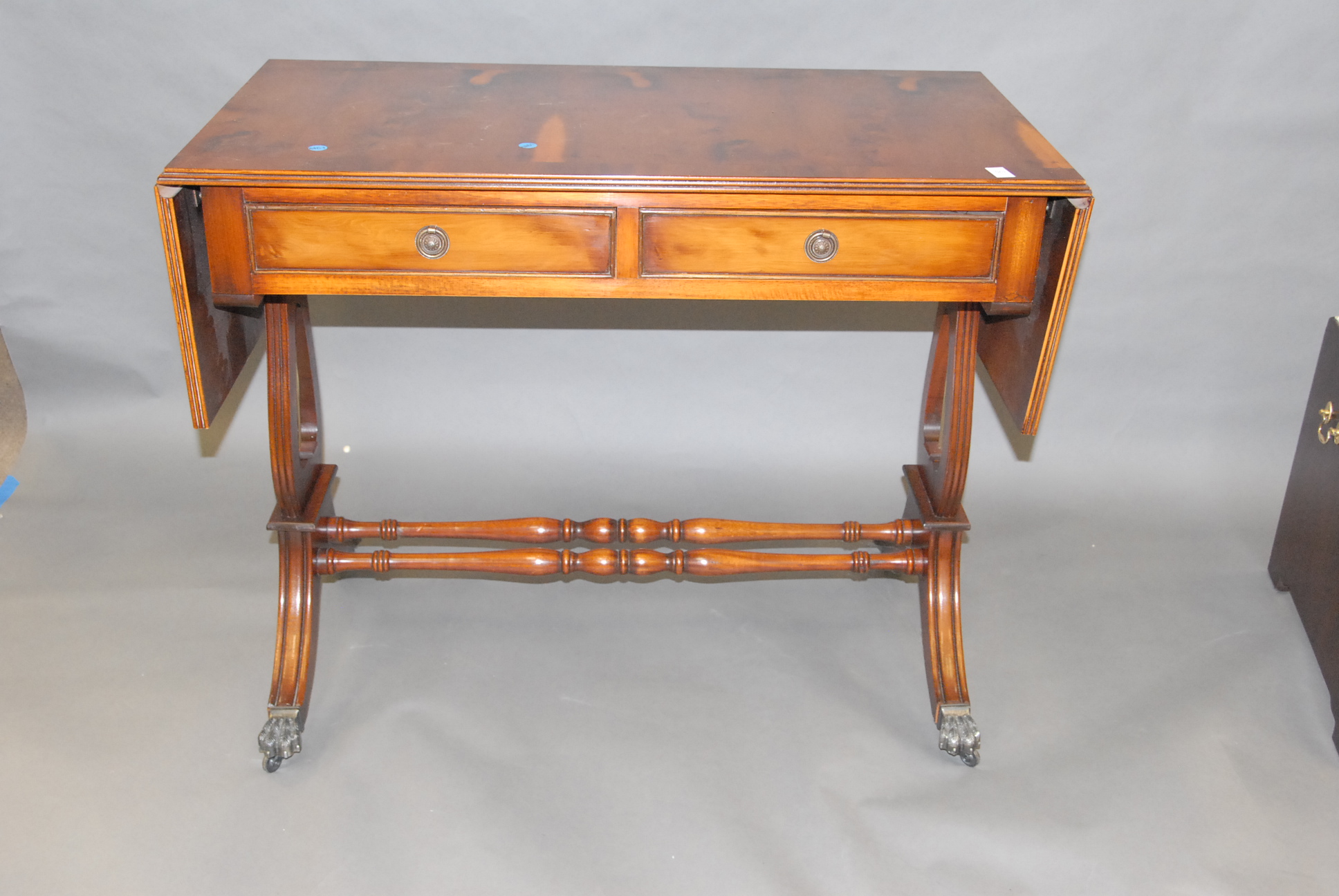 Burl wood drop leaf sofa table.
