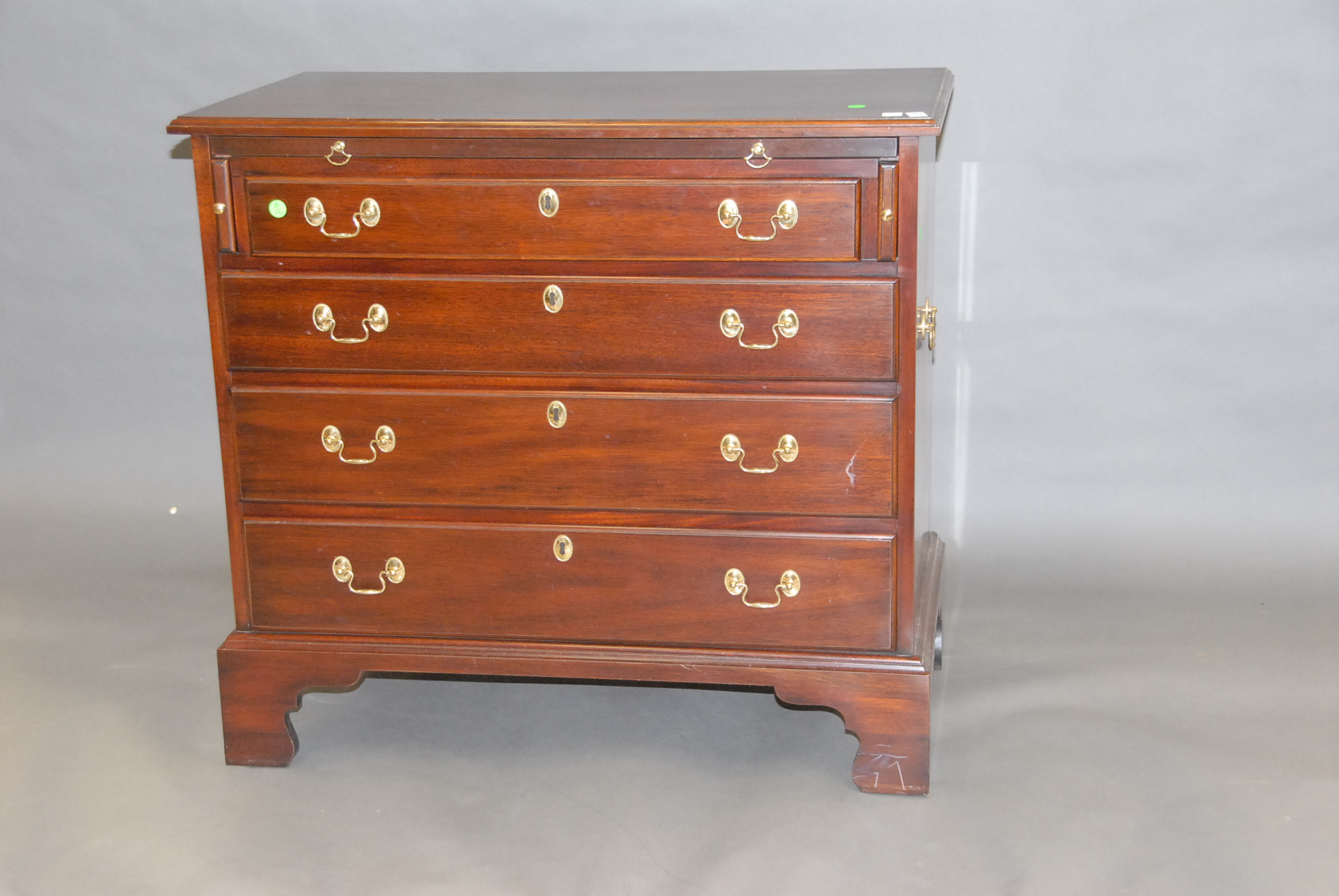 Pair of Henkel Harris mahogany bachelor’s chests, Chippendale style with pull out slide.