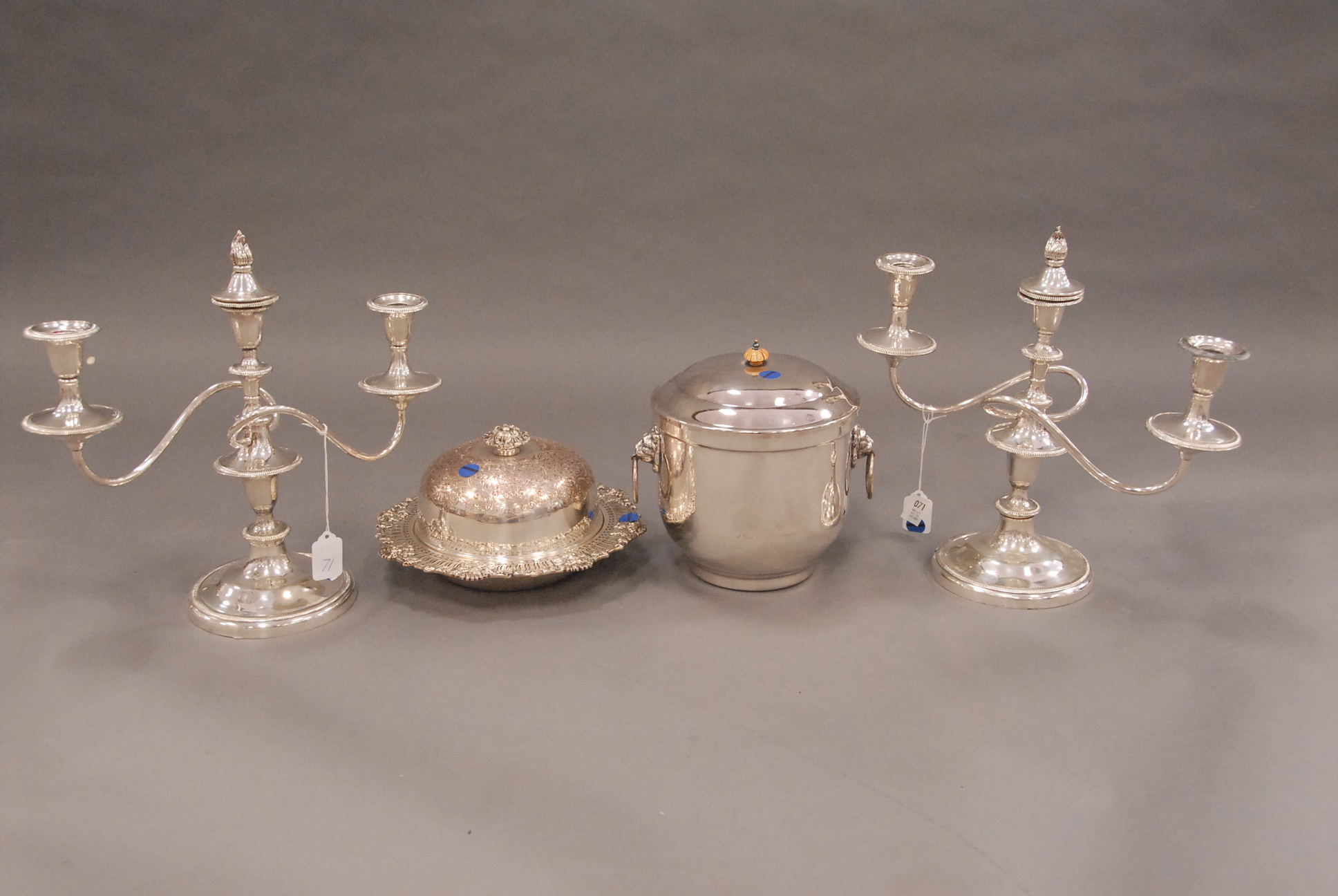 Four piece lot of silver plate to include a pair of candelabras one as is, covered butter dish, covered dish with an interior cover, and a covered ice bucket.