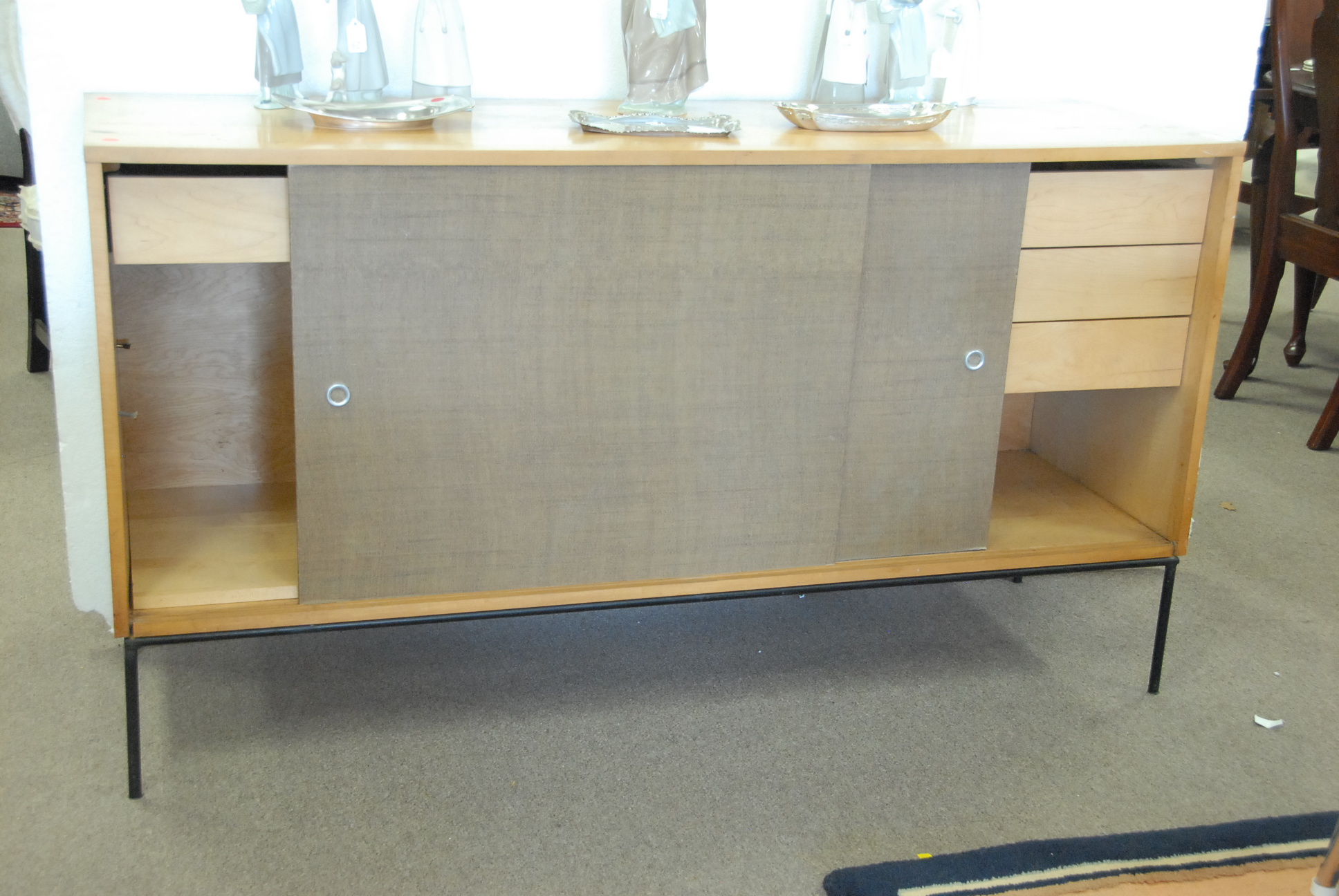 Paul McCobb planner group credenza with sliding doors and iron legs.