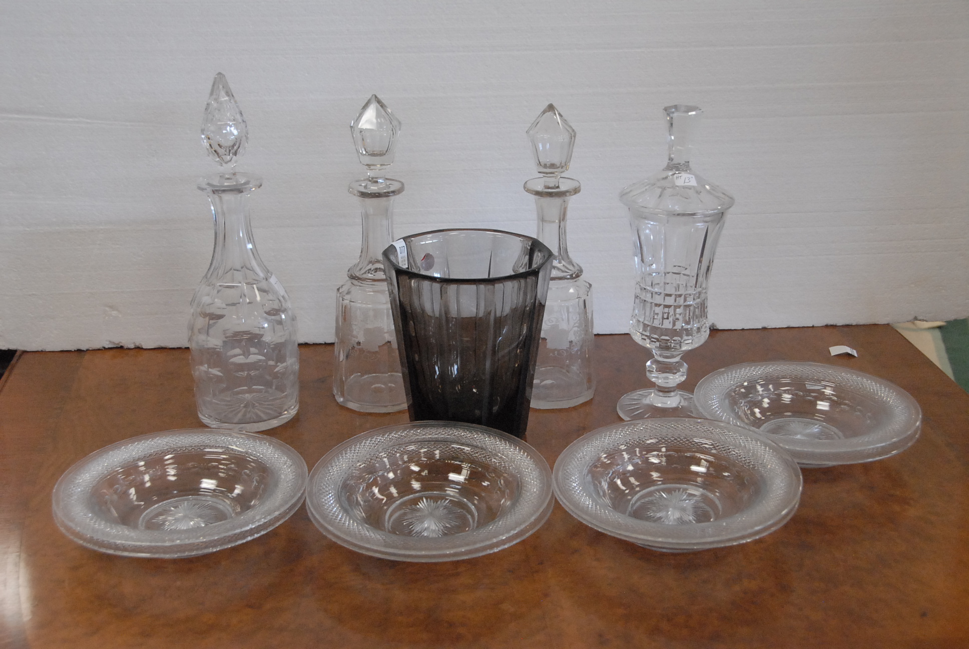 Group lot including three decanters, dark crystal vase, covered dish, cut crystal, and soup bowls.