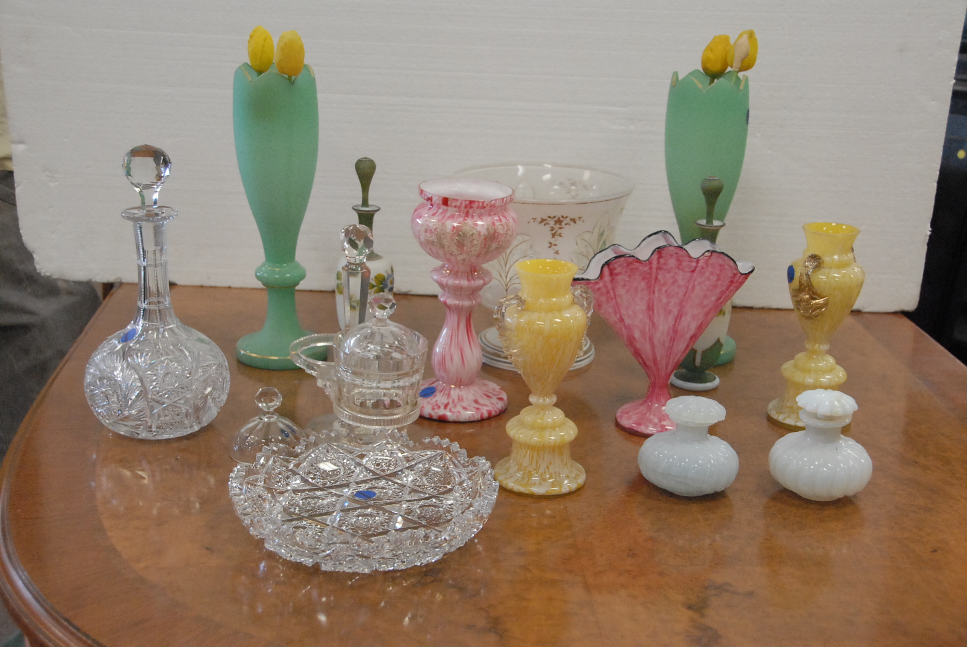Group lot to include a cut glass shallow dish, cut glass carafe, art glass vases, Bristol glass, pair of opalescent perfumes, one stopper as is.