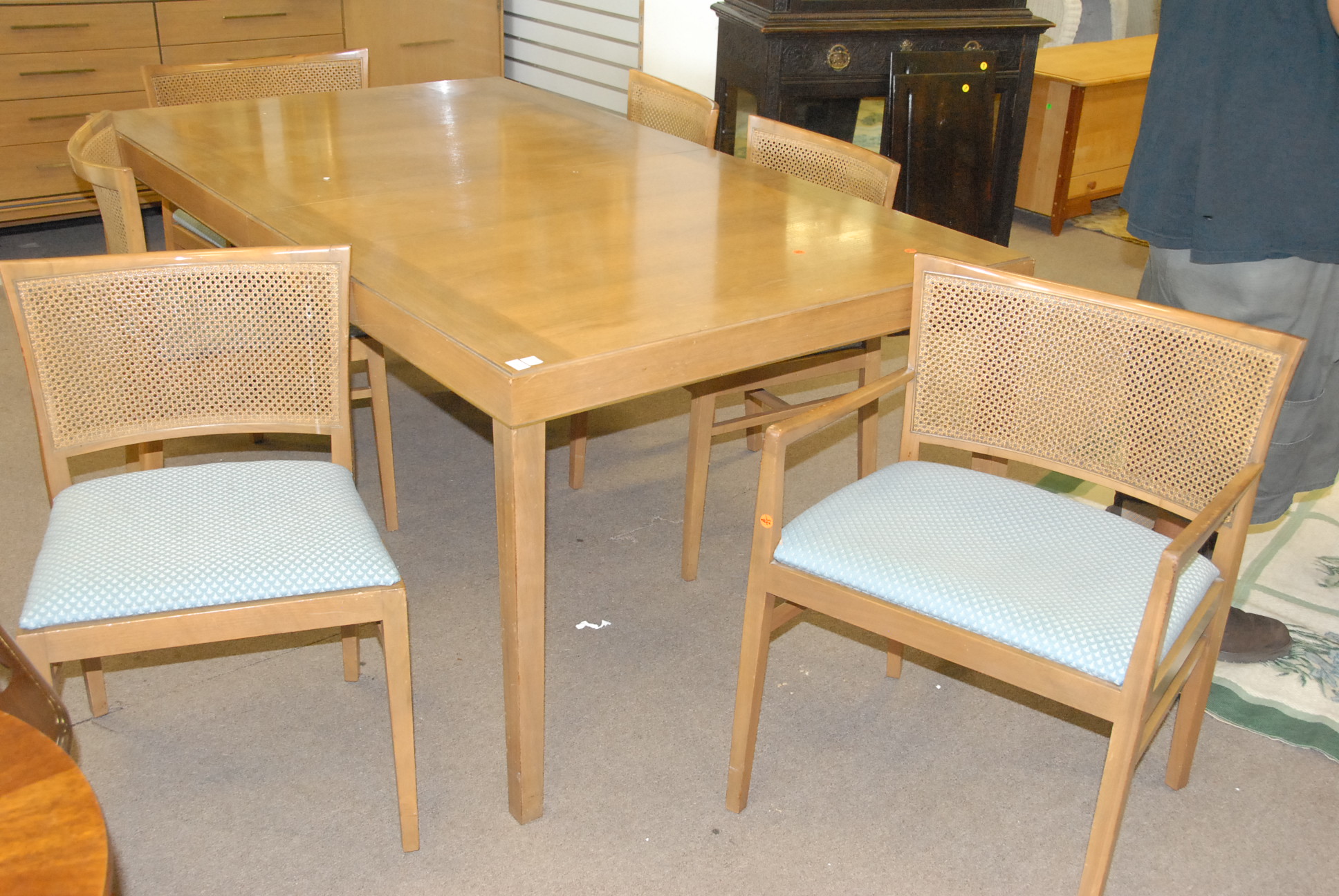 Eight piece dining set mid century Johnson Furniture Company, Grand Rapids to include a credenza, table, and six chairs, no leaves.