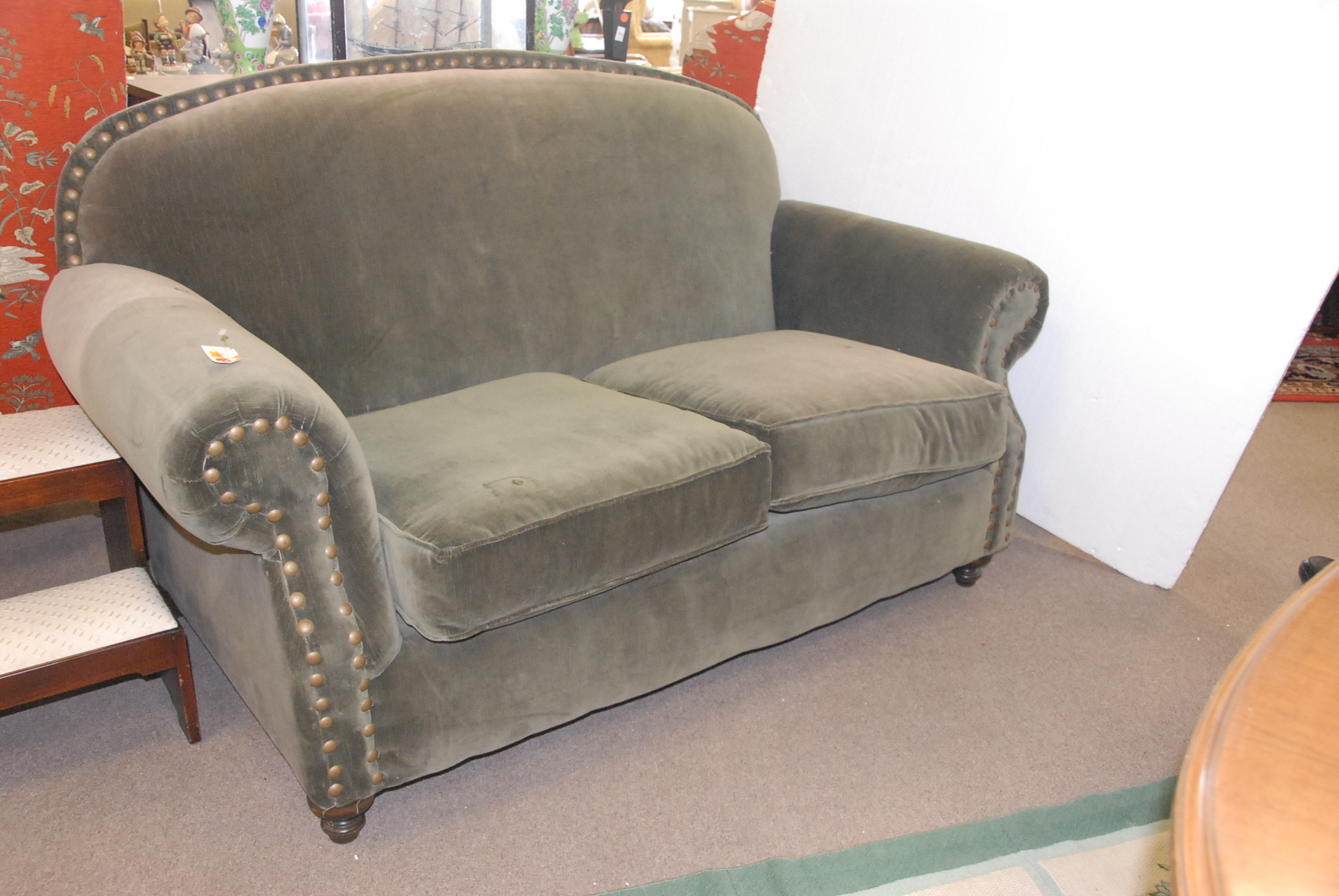 Upholstered love seat with large brass tacks.