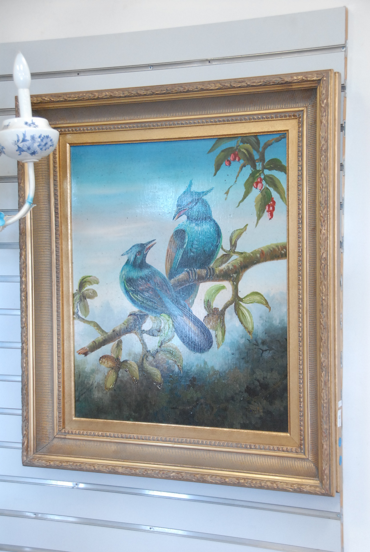 Decorative painting of two blue birds in a gold frame.