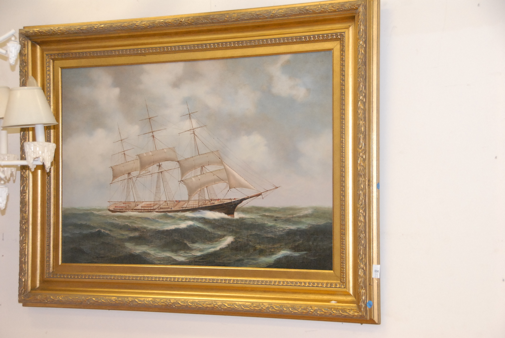 Decorative ship painting in a gold frame.