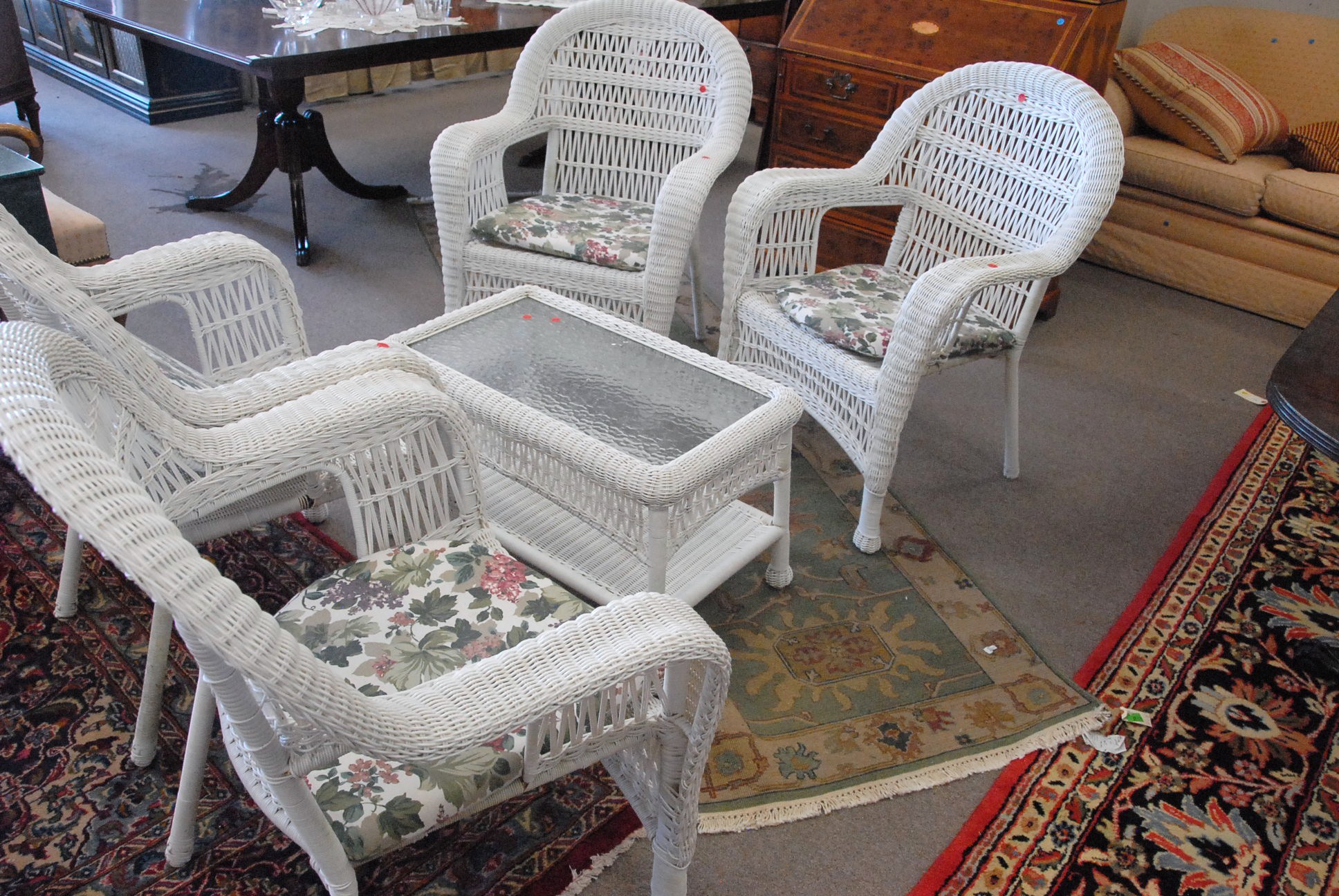 Five piece wicker lot to include four armchairs with cushions and a small glass top table.