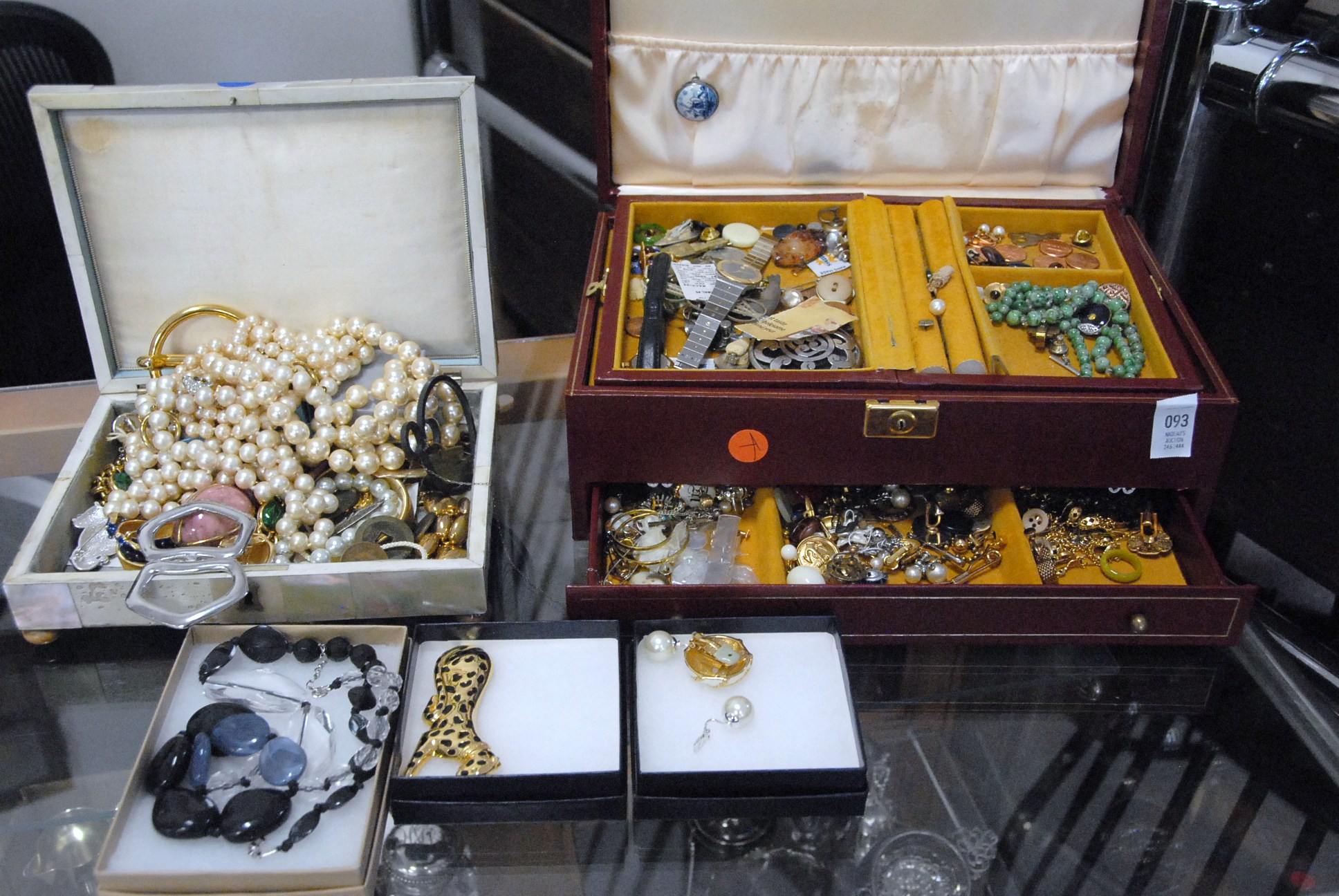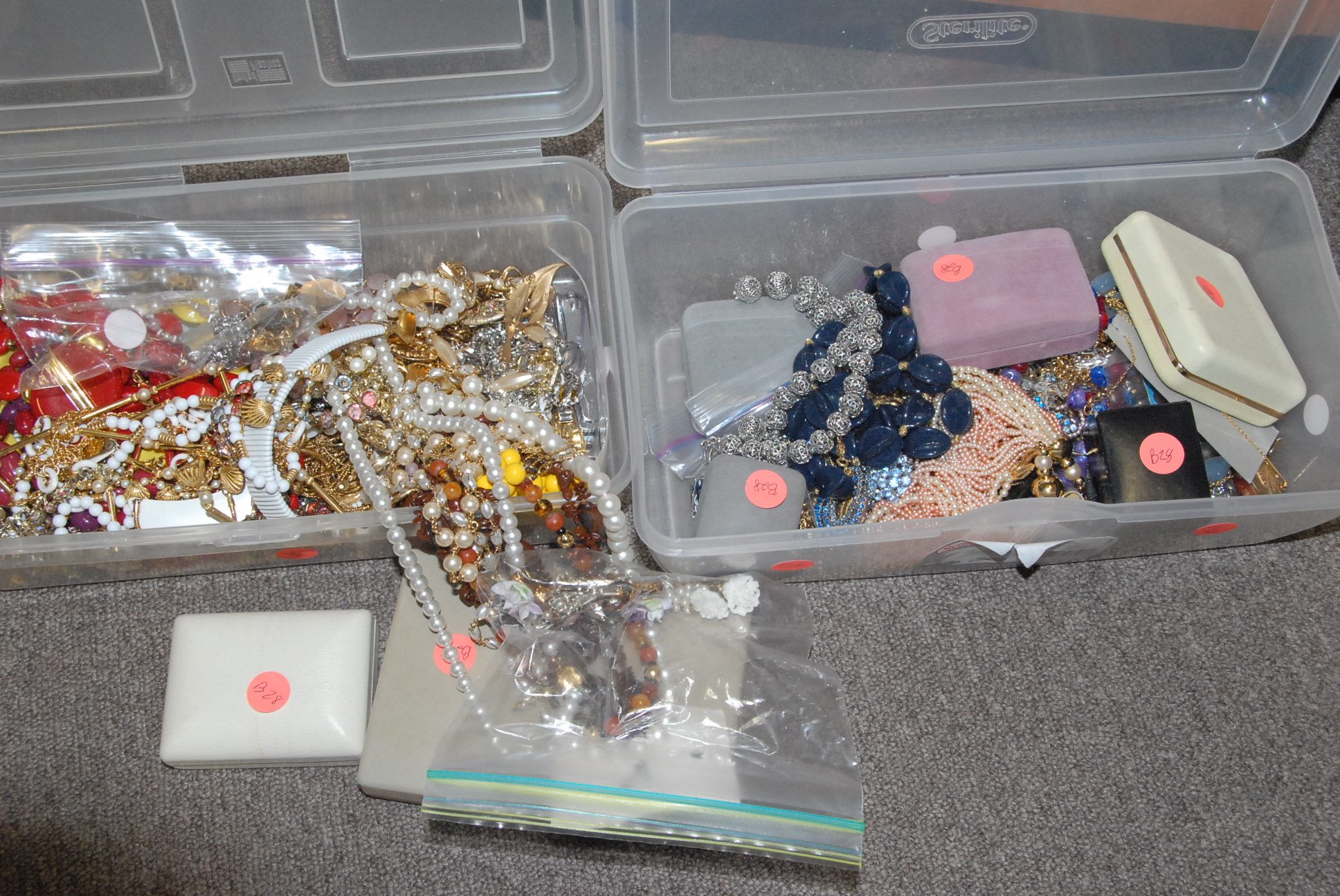 Two boxes of costume and gold jewelry.