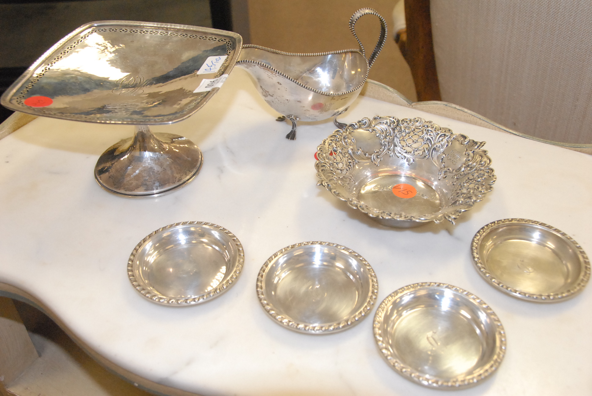 Sterling silver lot to include a compote, small dish, gravy boat, and four coasters.