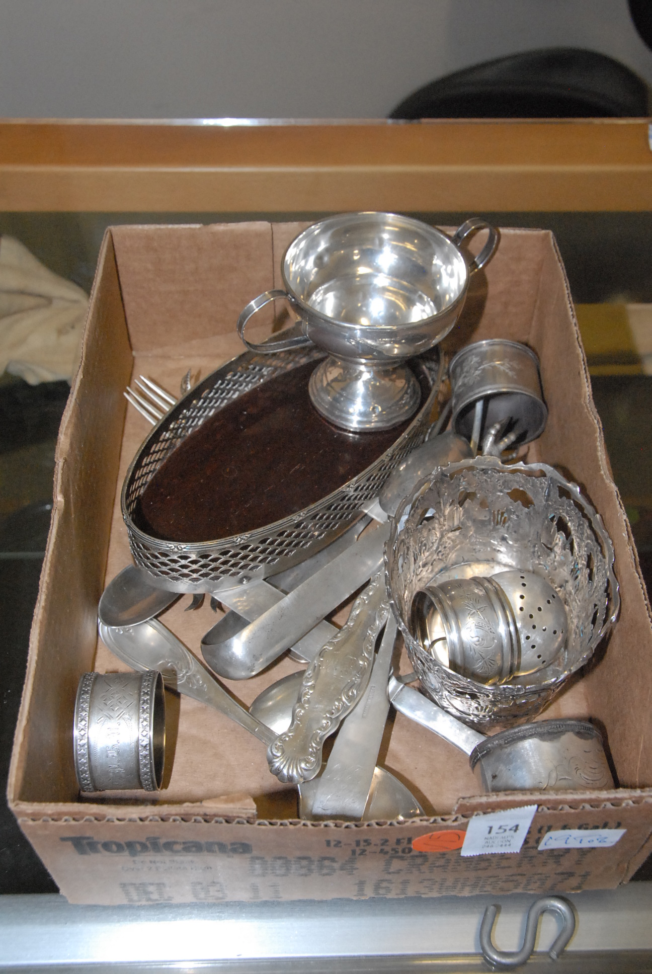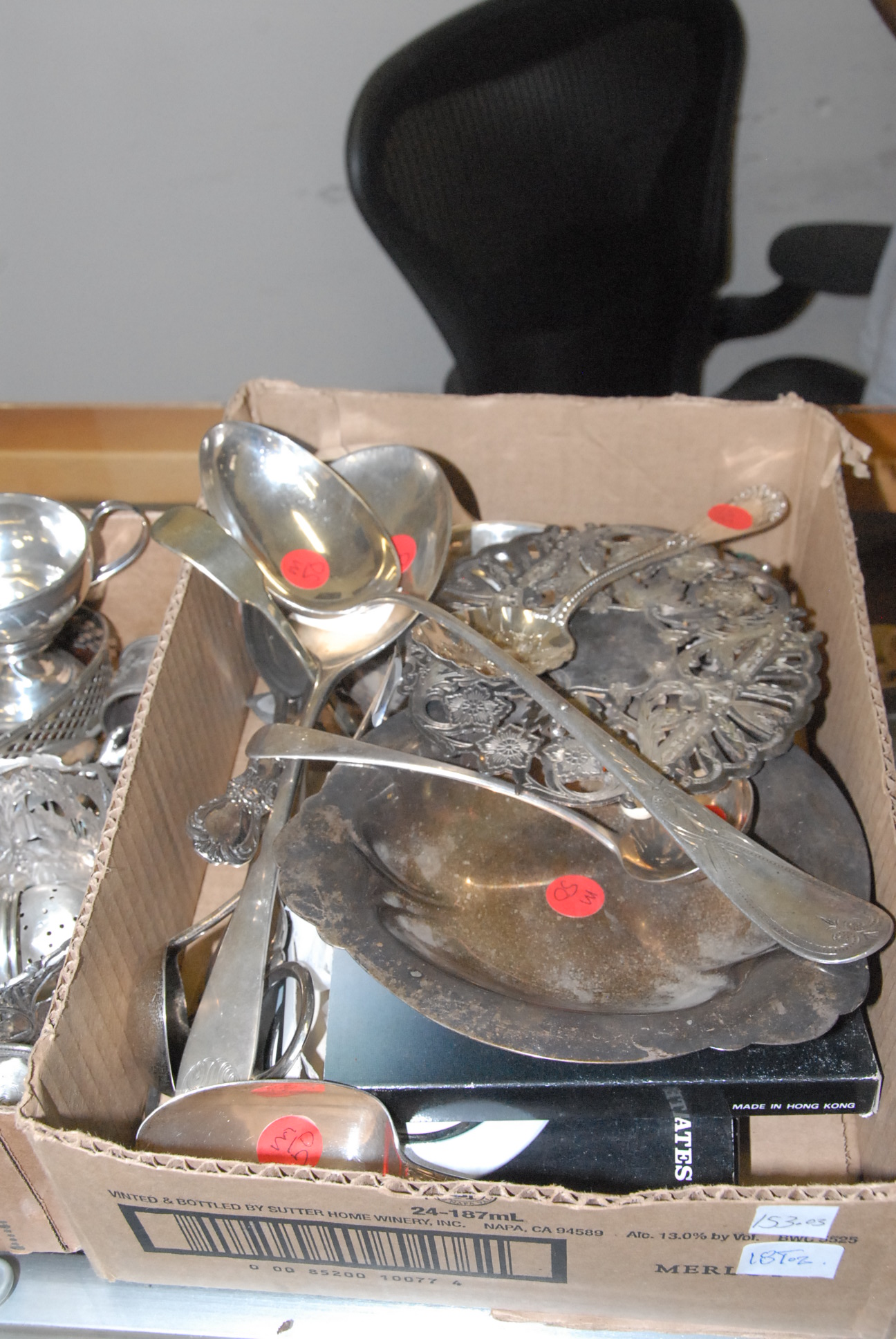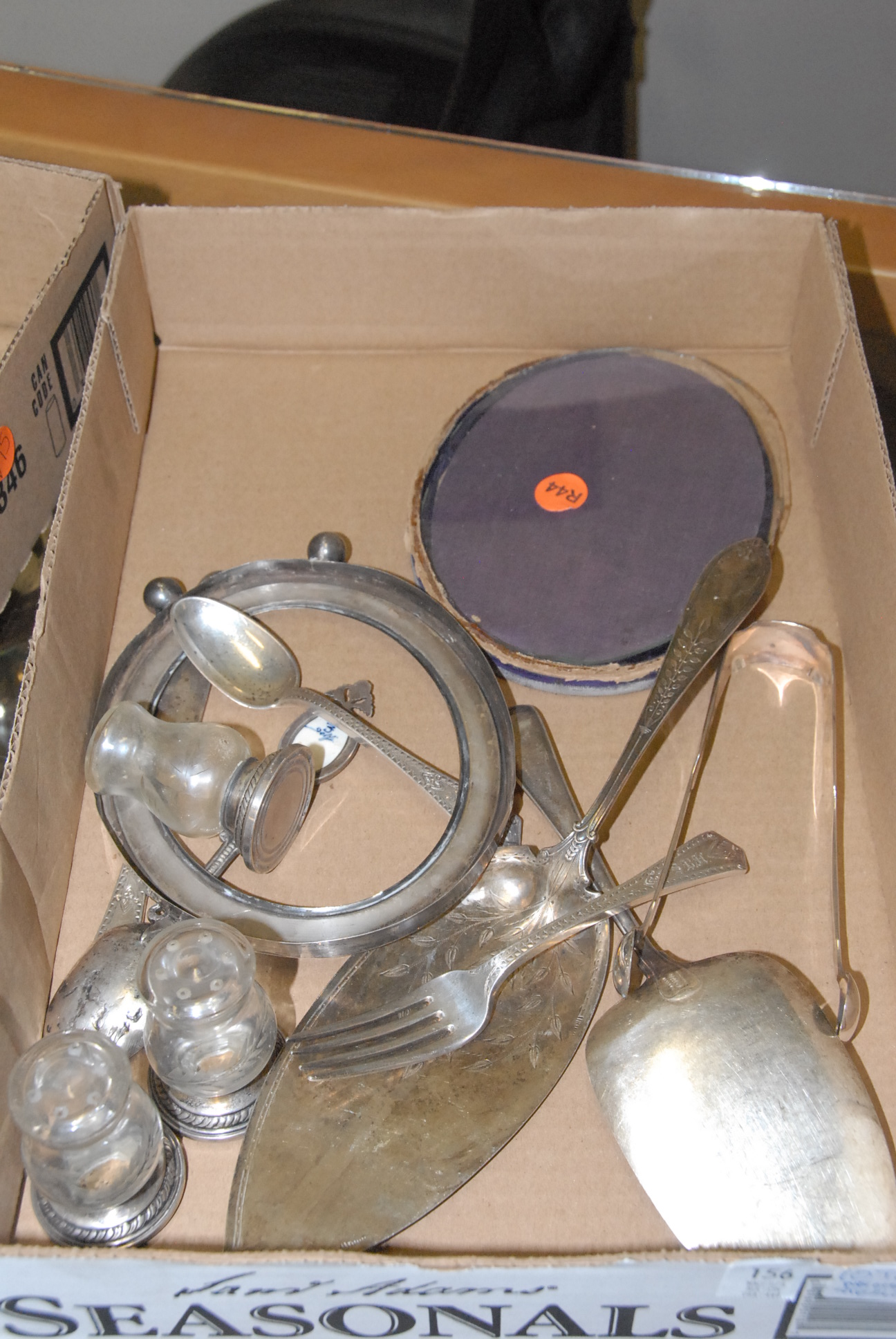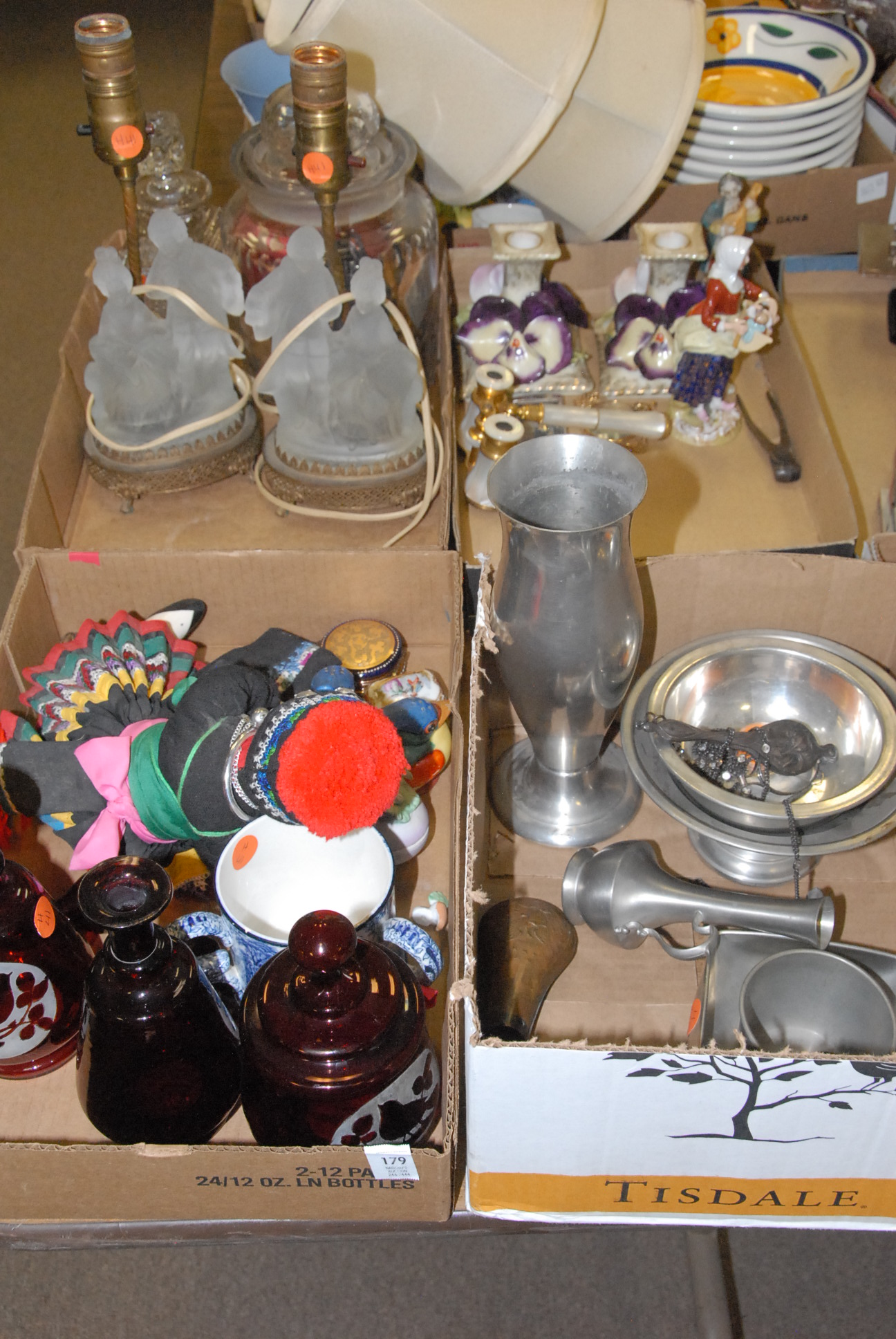 Four box lots of miscellaneous items including pewter covered cologne bottles, pair of lamps, opera glasses, couple of small lift top boxes, candle sticks, etc.