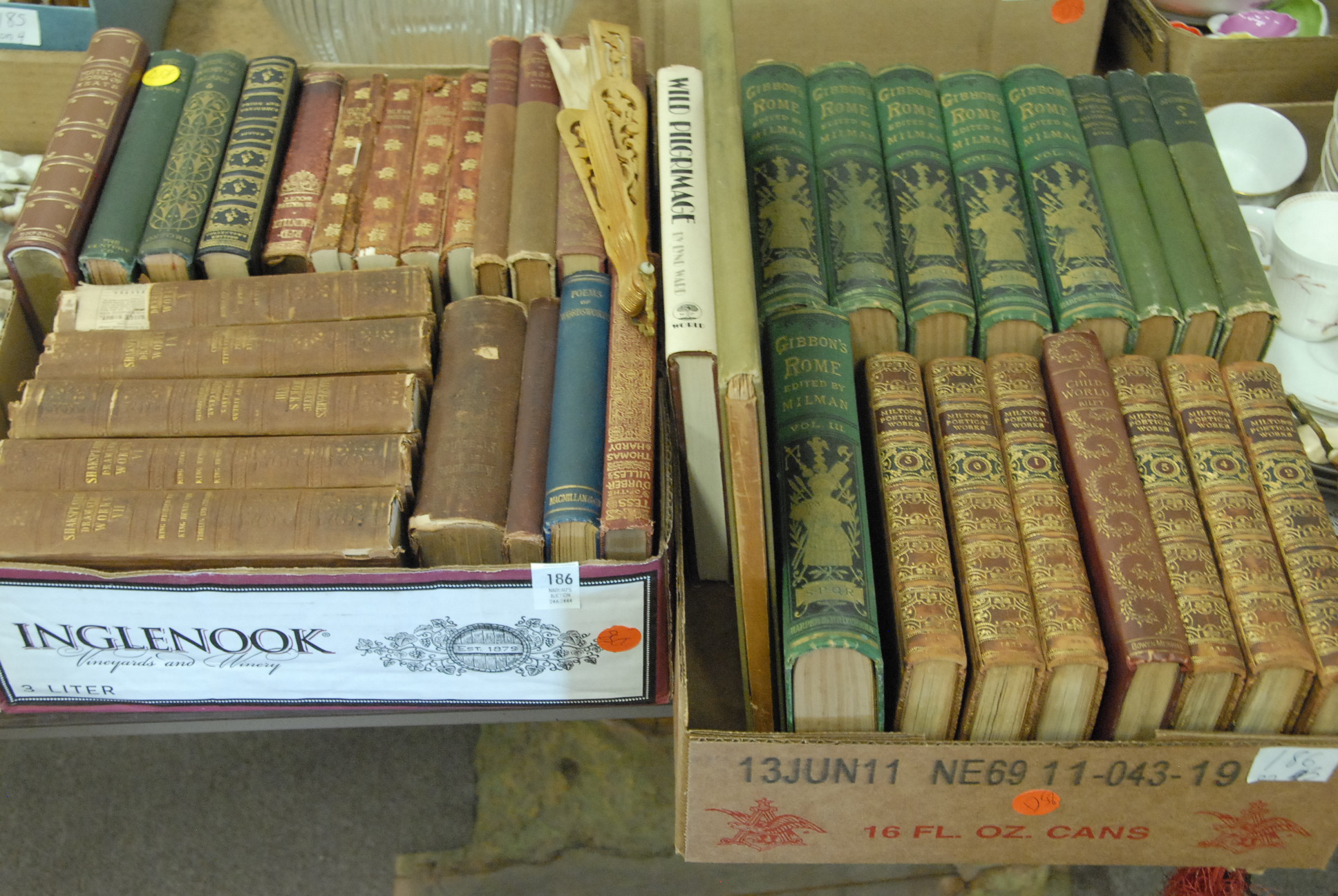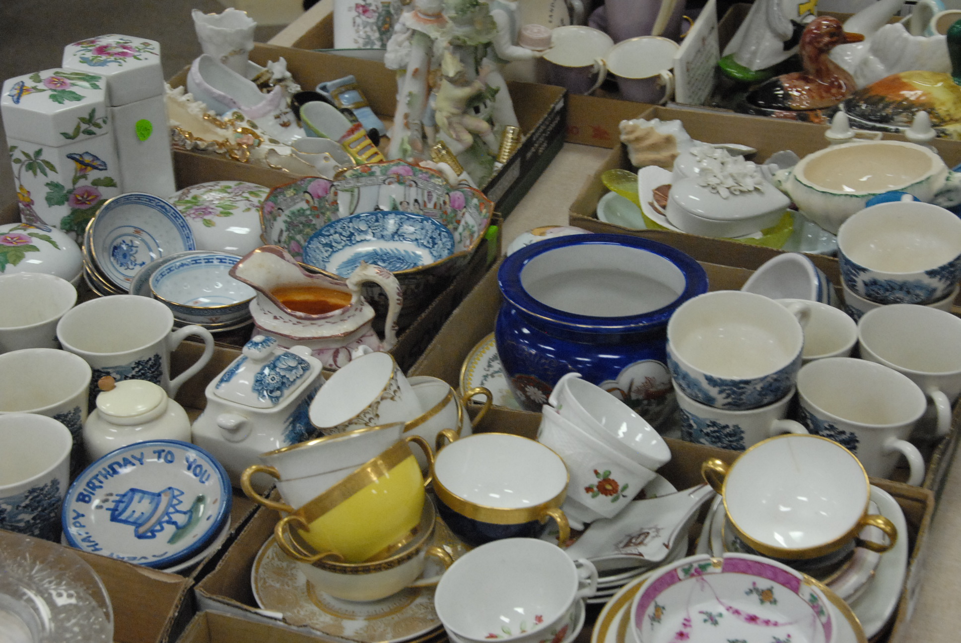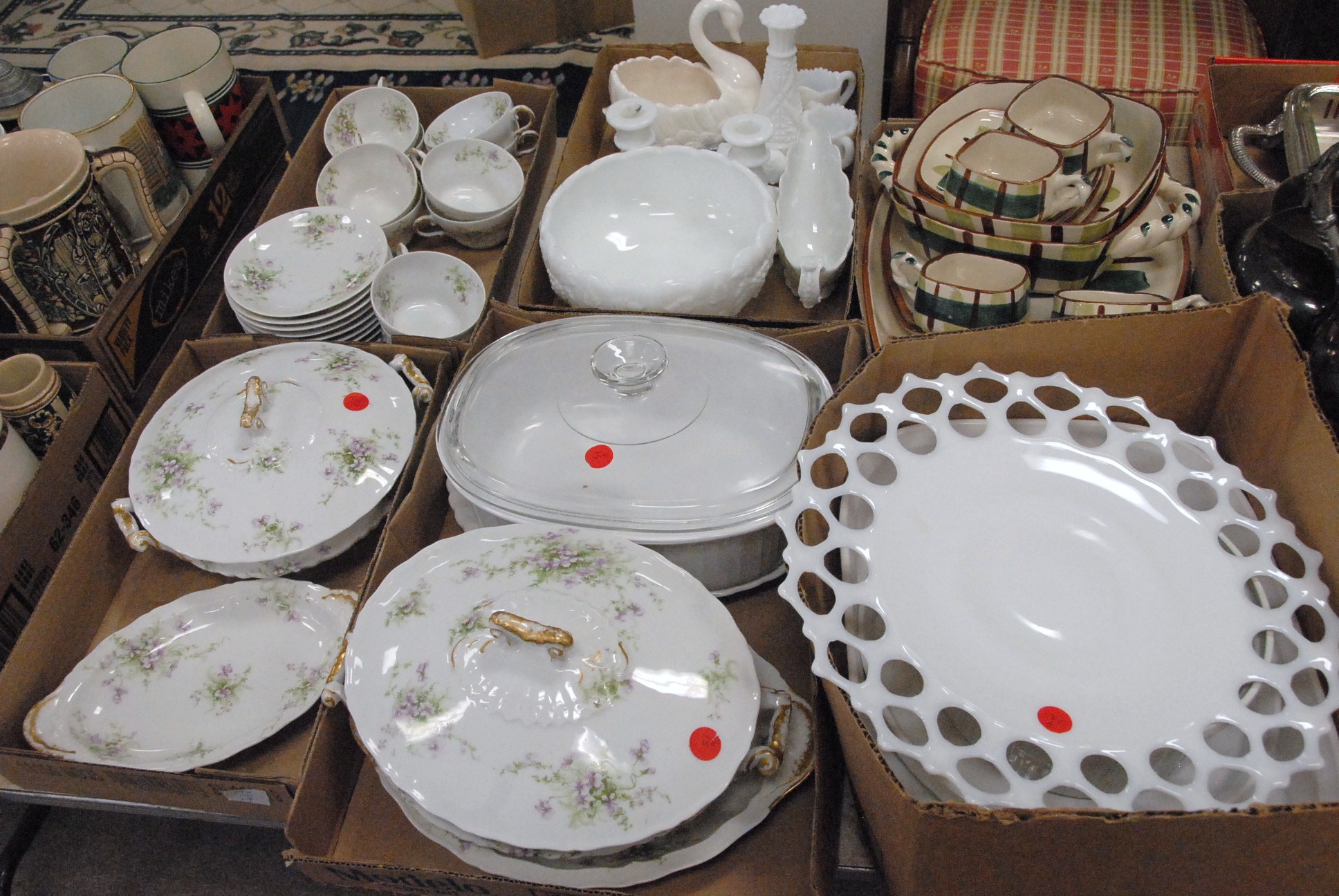 Fourteen box lots of china including mugs, one leather mug mounted with silver, milk glass, Limoges, Royal Dalton mug, candy dishes, plates, cups, saucers, lamps, etc.