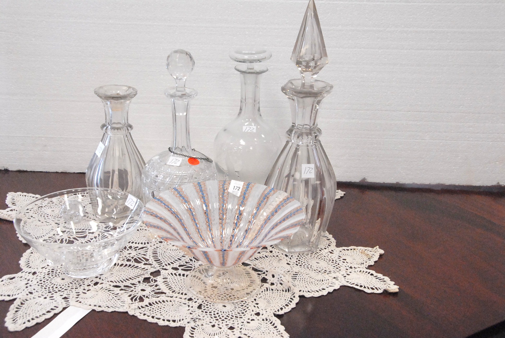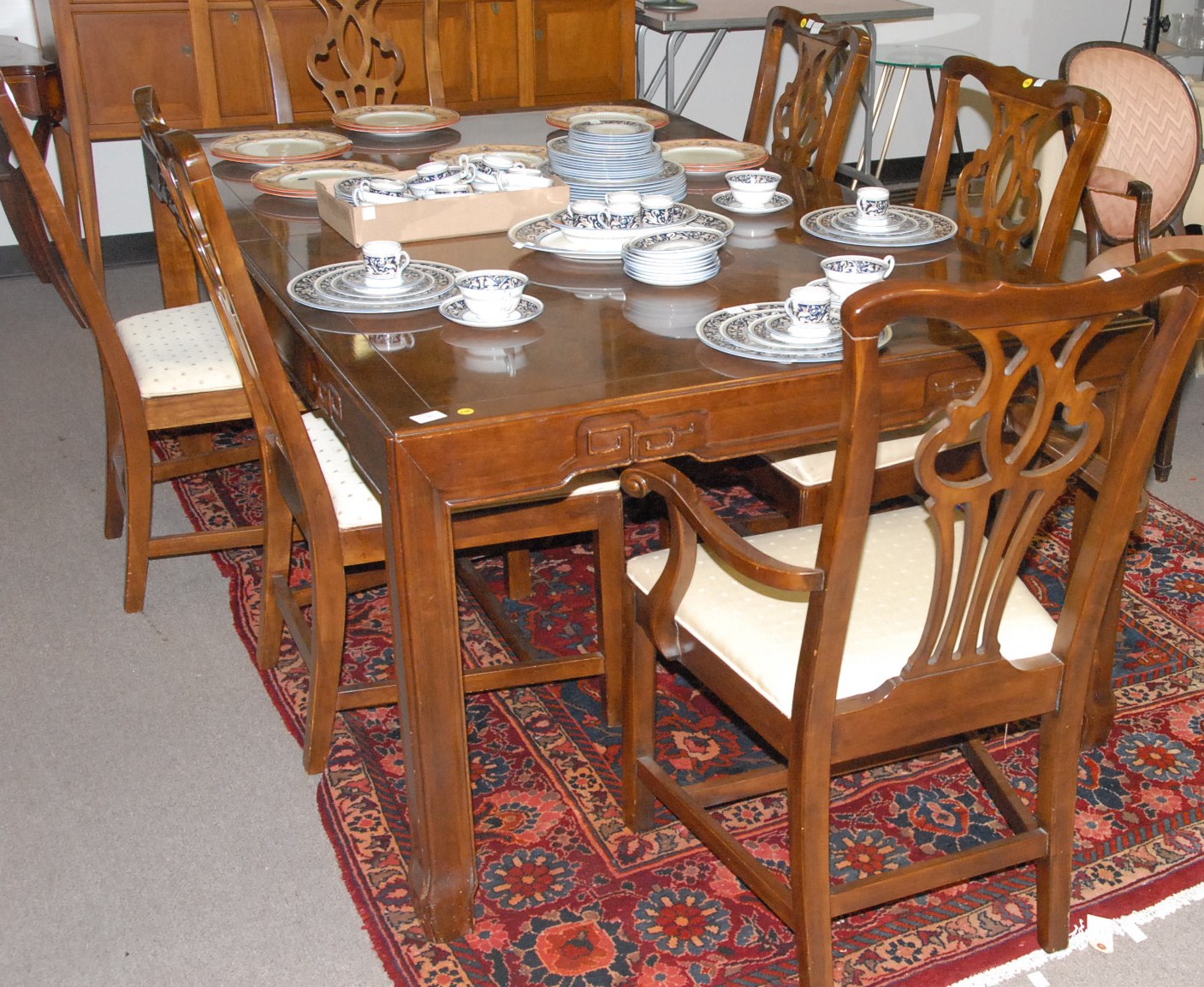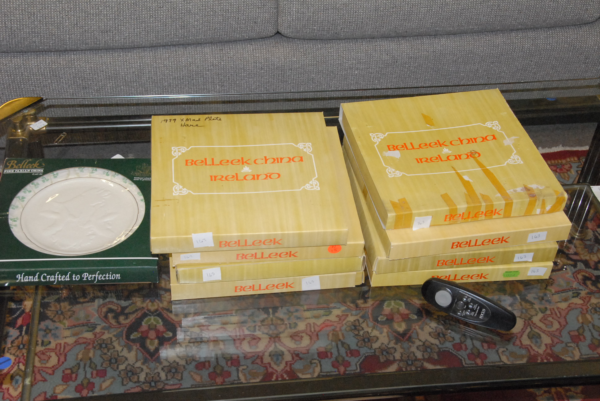 Fourteen box lots of china including mugs, one leather mug mounted with silver, milk glass, Limoges, Royal Dalton mug, candy dishes, plates, cups, saucers, lamps, etc.
