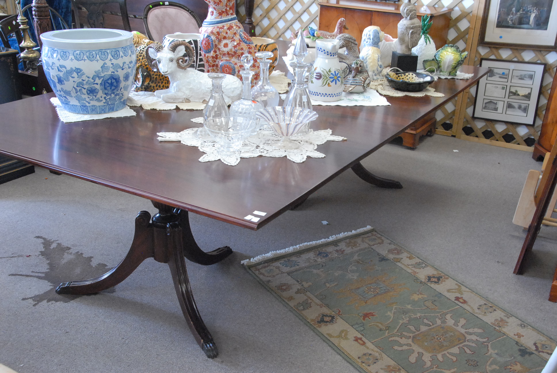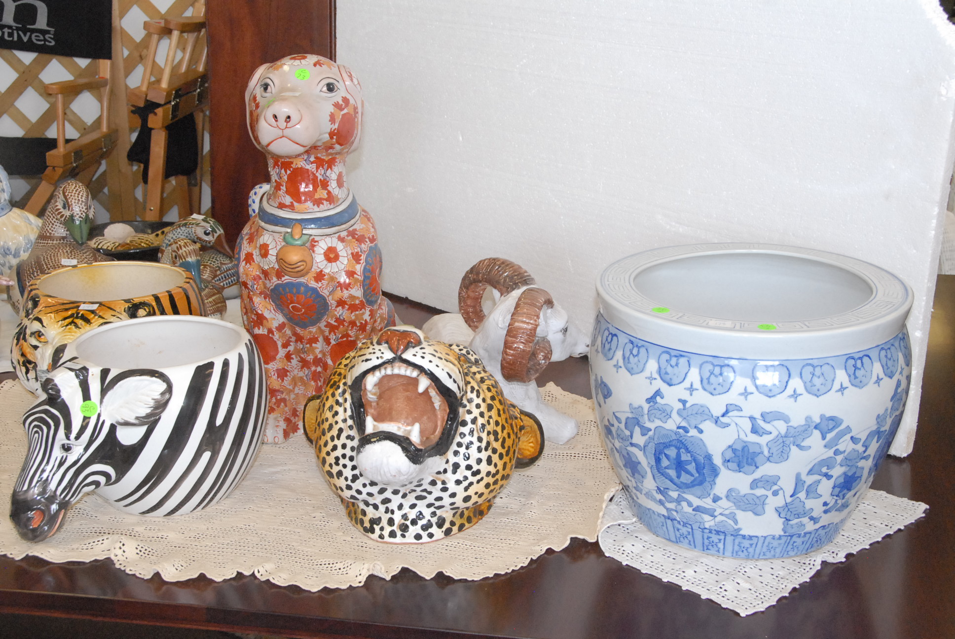 Large lot of ceramics and majolica to include animal pots, animal figures, pig tureen and a goose tureen, pitchers, large blue and white planter, and a lamp.
