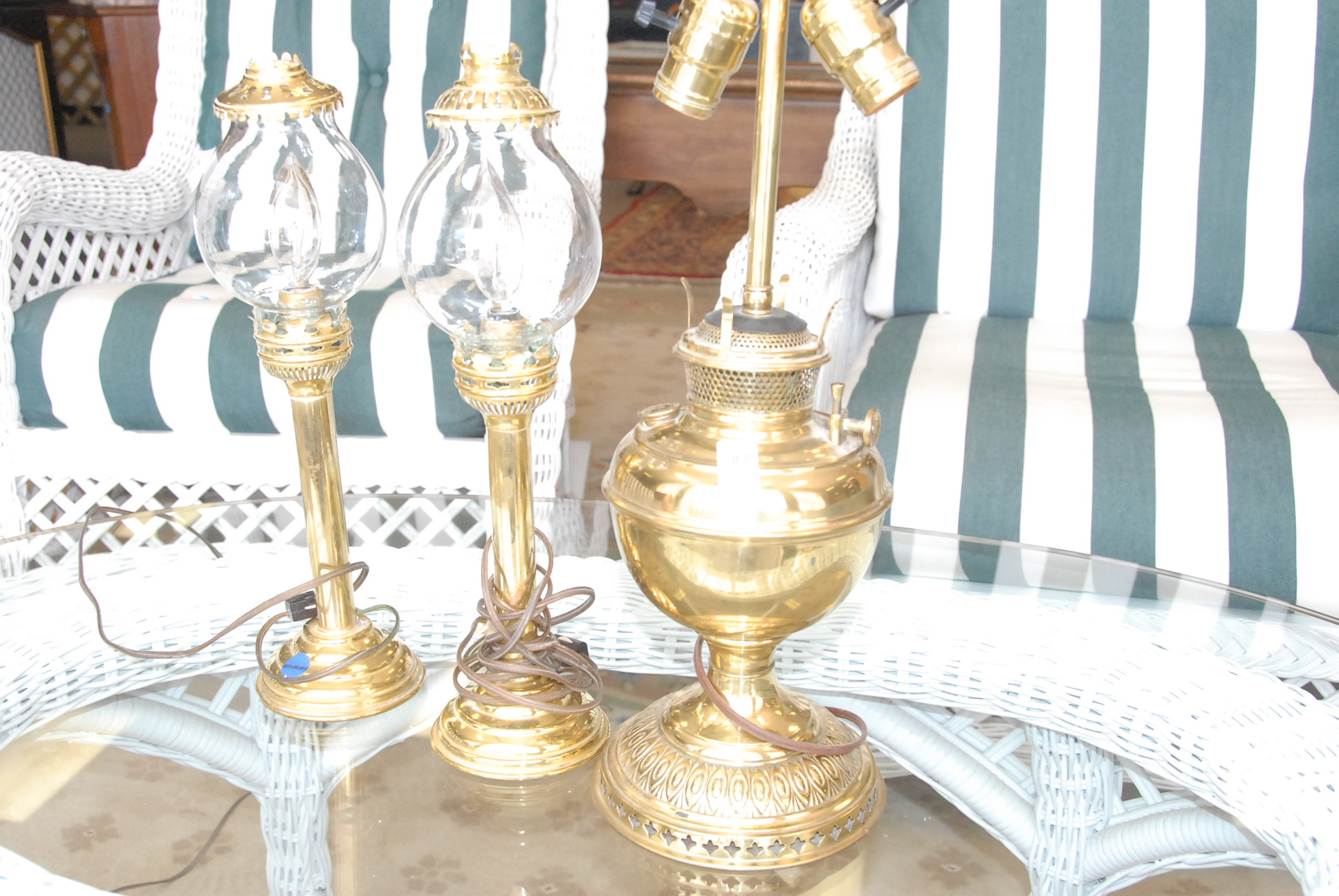 Group of three items to include a bronze lamp, ceramic vase and glass vase