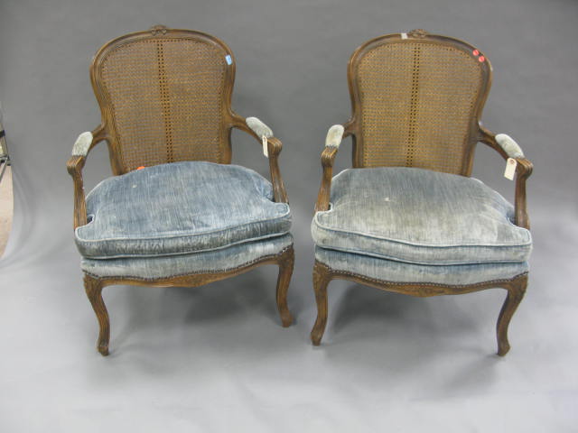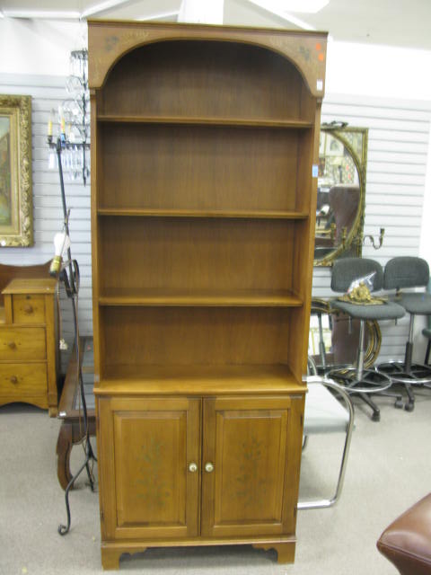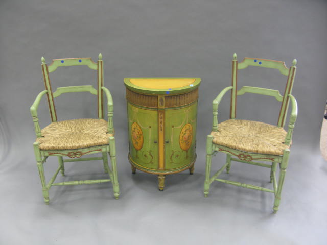 Three piece lot, half round stand with doors and two rush seat armchairs