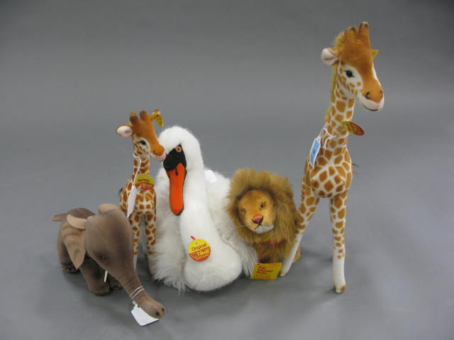 Five piece lot of Steiff to include lion, elephant, two giraffes and swan