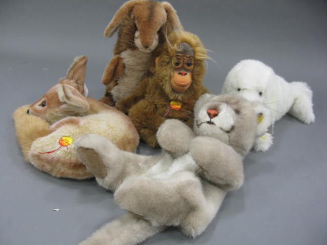 Five Steiff animals, puppets, rabbit cat, monkey, fox and seal