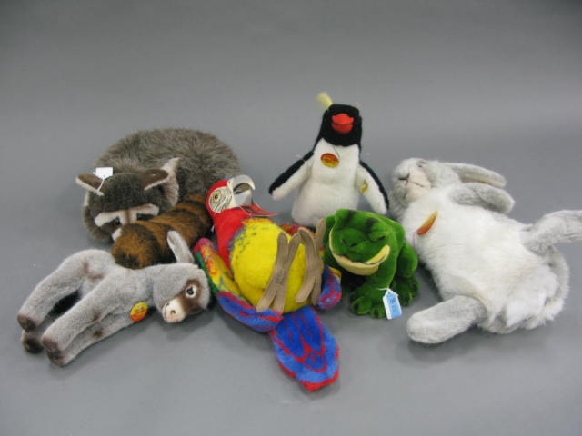 Five piece Steiff lot to include, rabbit, parrot, frog, donkey, penguin, and raccoon
