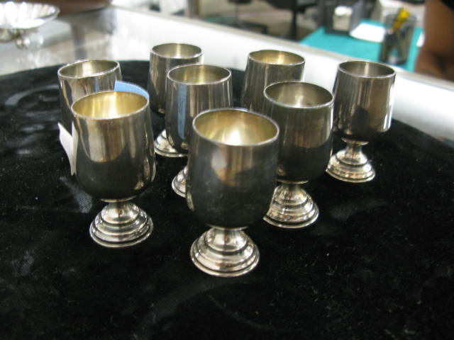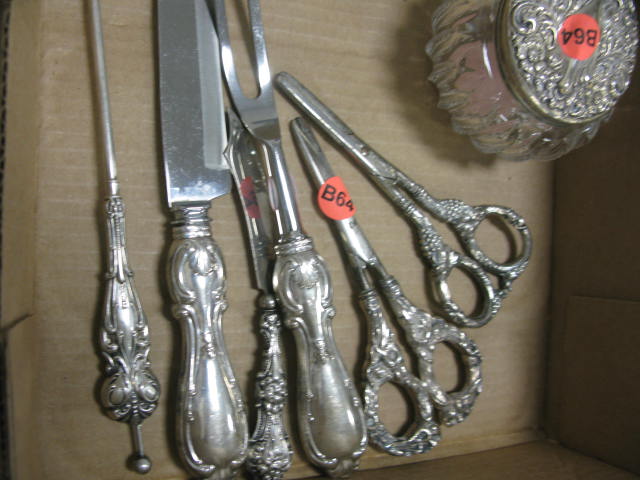 Box lot with sterling handled pieces, knives, shears and crystal jar