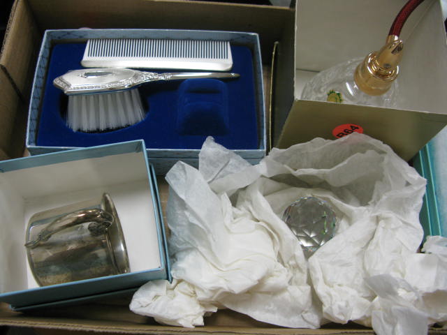 Box lot to include Waterford perfume, silver child’s mug, child’s brush and comb, Tiffany pen