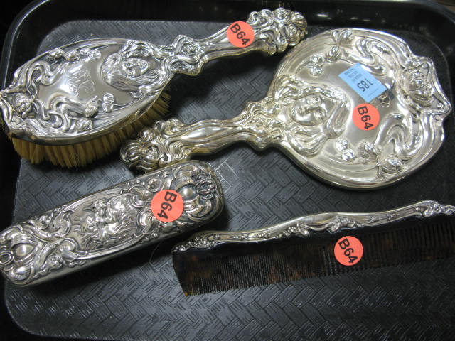Four piece sterling lot to include hand mirror, two brushes and comb