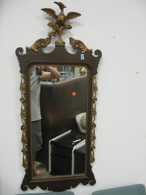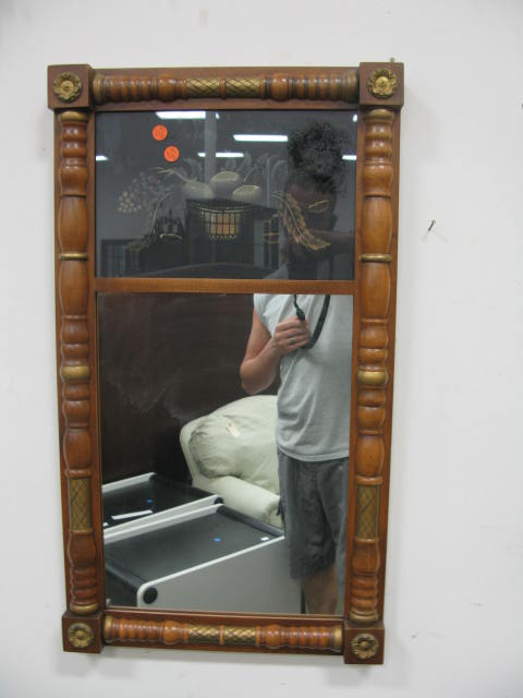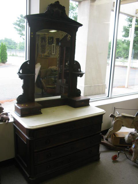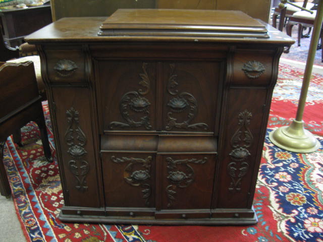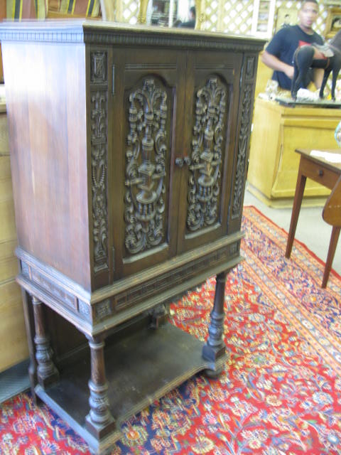 Carved radio cabinet, as is along with figural mirror stand without mirror