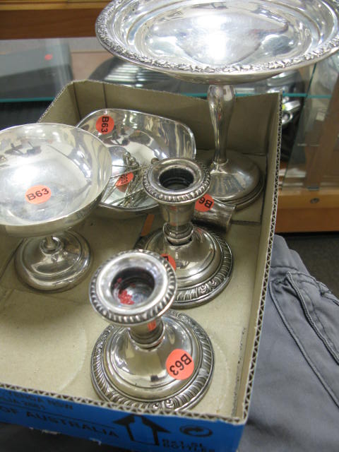 Box lot of sterling to include candlesticks, bowl, compotes, shot glass and picks