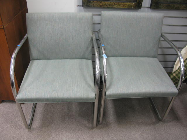 Pair of Knoll armchairs, two small file cabinets, two upholstered stools along with three pieces of china Higgans glassware ashtray, pitcher and small teal/gold pitcher