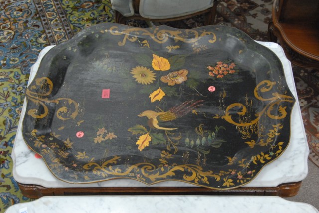 Primitive tole tray with painted bird and flowers.
