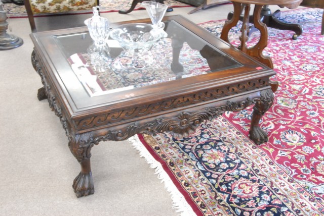 Mahogany Chippendale style glass top coffee table with paw feet.