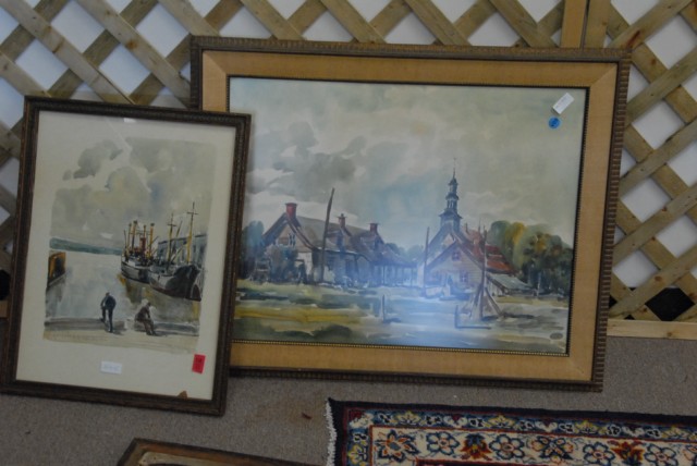 Two Canadian watercolors of harbor scene and one with church and large building.
