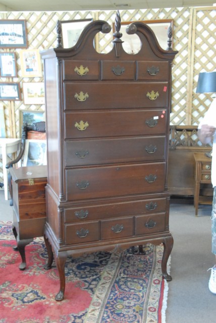 Mahogany Queen Anne style highboy with broken arch top.