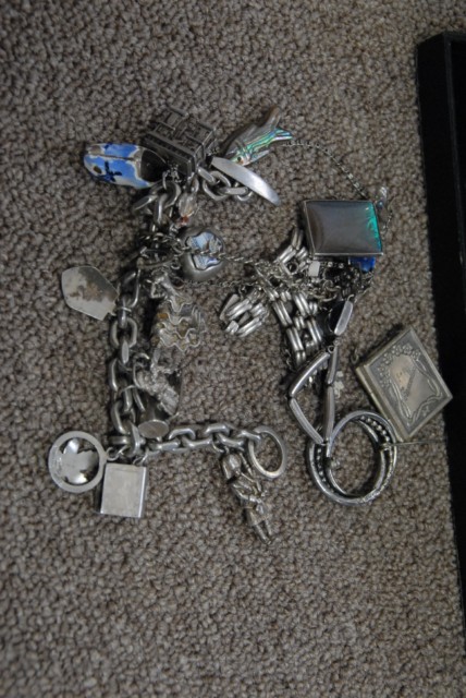 Group lot of various sterling silver jewelry to include charm bracelet, 2 bracelets, pins, earrings and several other items.