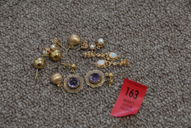 5 pairs of gold earrings having various stones including pearls, amethysts, opals, and round beads.