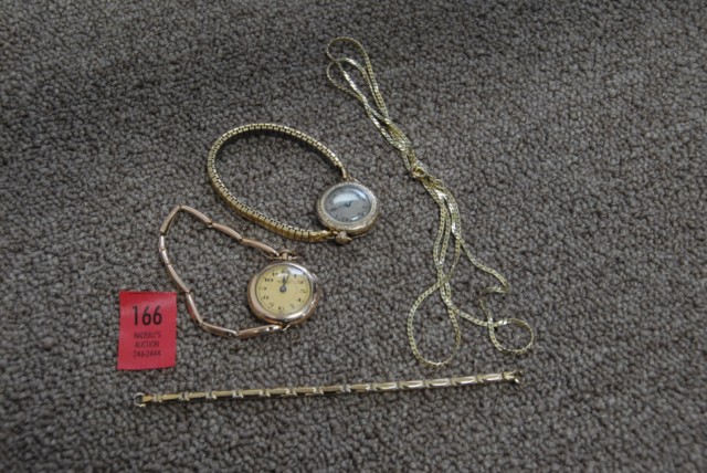 Box lot containing gold plated ladies wristwatches and gold plated chain.