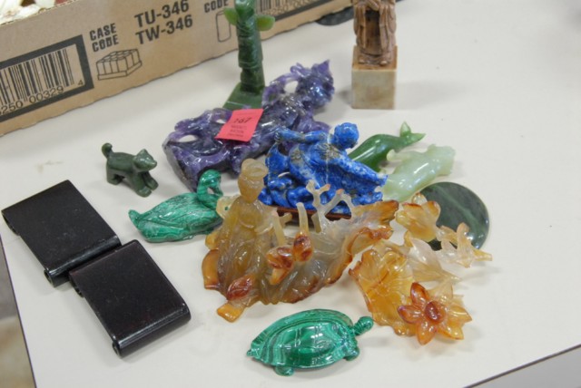 Group of hard stone figures including amethyst, malachite and various others.