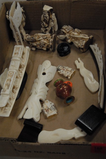 Group of ivory and ivorine figures and boat.