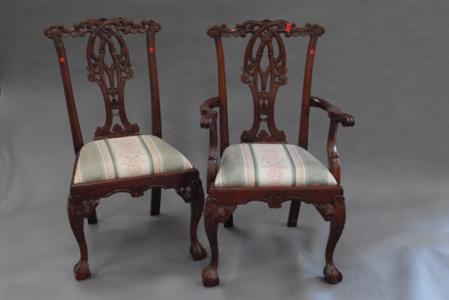Set of 8 Chippendale style mahogany dining chairs with ball and claw feet.
