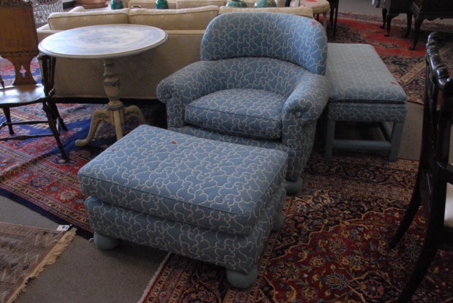 Upholstered two part chaise chair and ottoman.