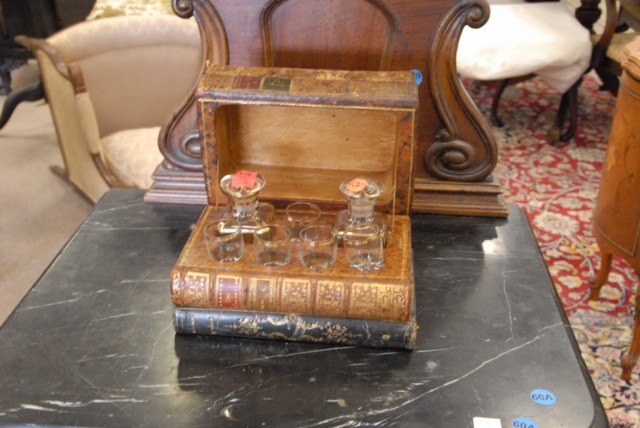 Cellarette leather-bound books with lift top box, two bottles and 5 shot glasses.