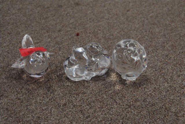 3 small Steuben animals including a pair of dogs and two birds.