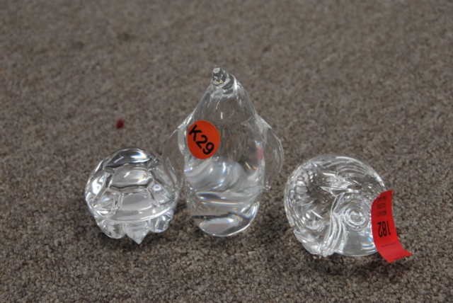 3 Steuben figures including a fish, penguin and turtle
